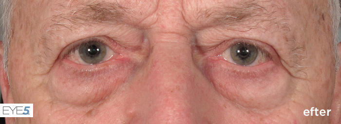 Begge øvre øjenlåg opereret med opstramning af løftemuskel ('ptose”) og overskydende hud fjernet.
