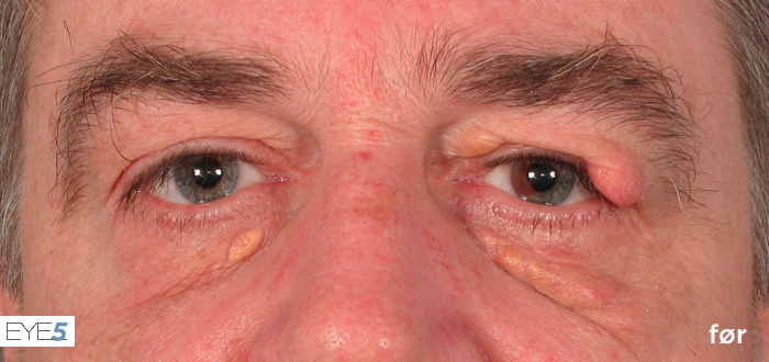 Xantalasmatae (cholesterolaflejringer i huden, her øvre og nedre øjenlåg) fjernet vha. Erbium:YAG laser og lipom (fedtknude) kirurgisk fjernet
